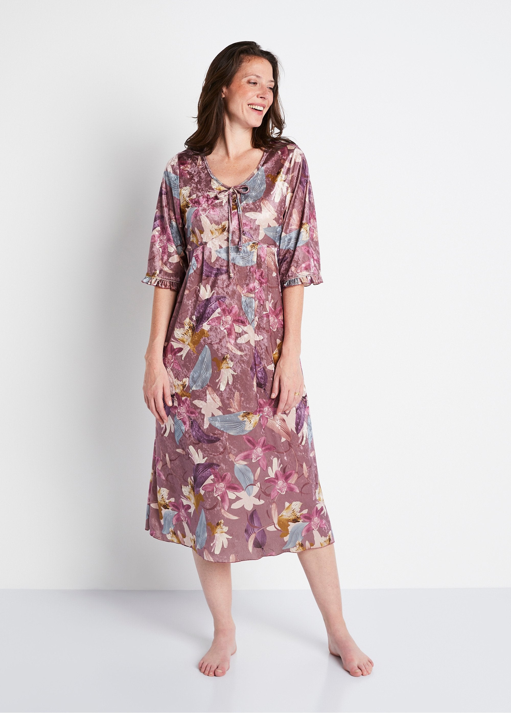 Un activo de encanto y comodidad, el vestido de azafata envuelve la silueta con la calidez de su terciopelo y la feminidad de su estampado. Lazo elegante en el escote en V. Se frunce debajo del canesú del pecho para brindar una agradable plenitud. Bies en el escote. Acabado de abejorro en el bajo de las mangas, en el codo y en el bajo.