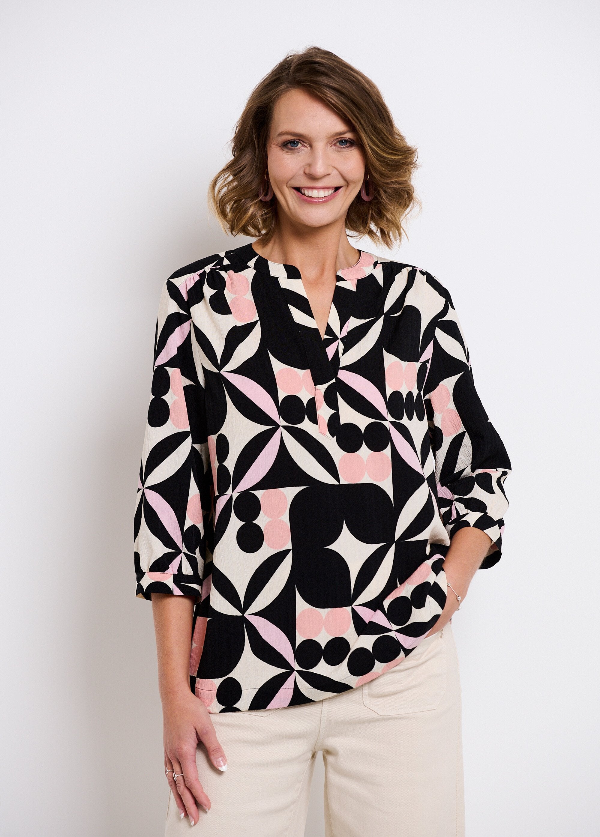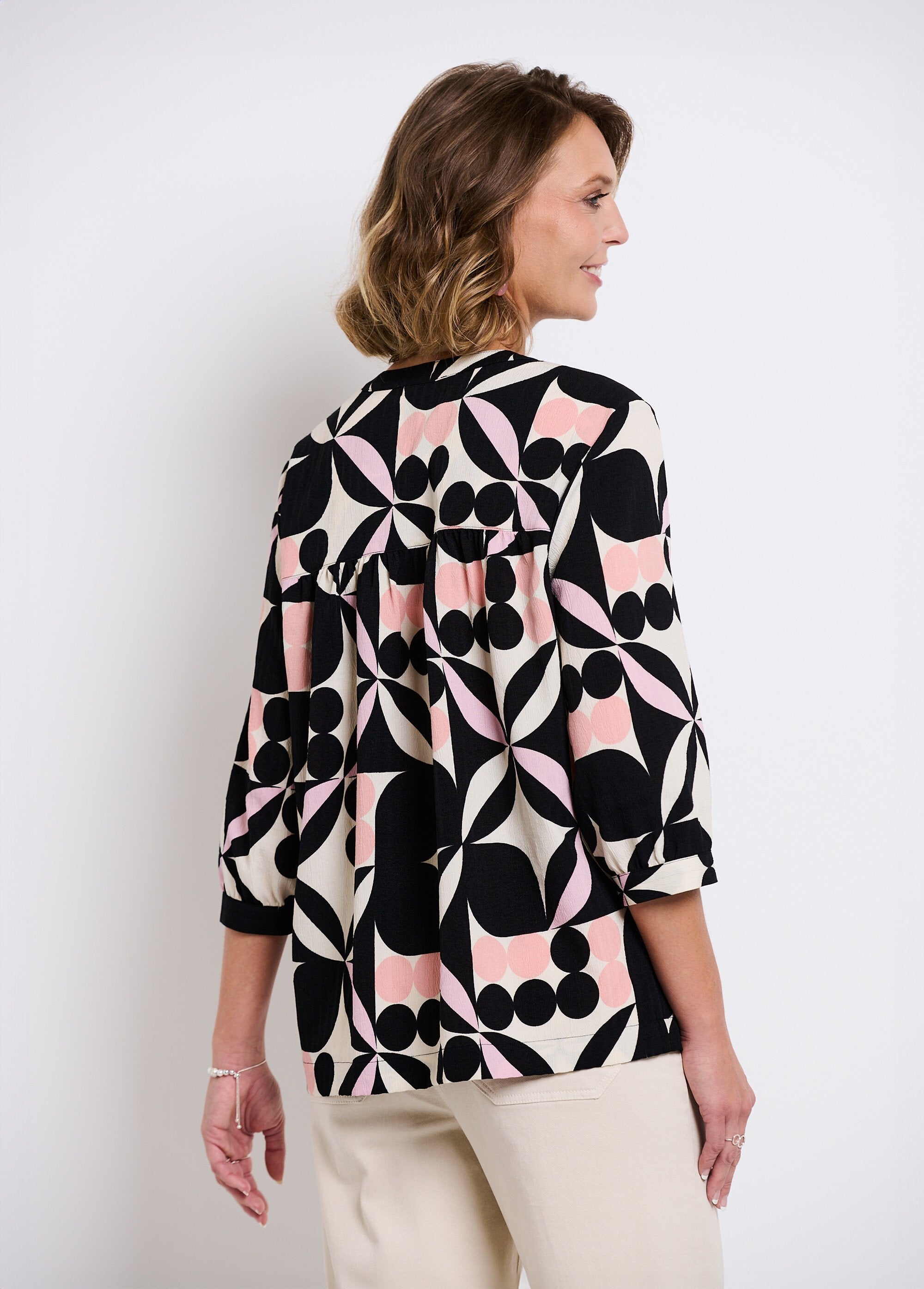 Línea holgada, tejido fluido, estampado moderno... La túnica cultiva la elegancia y el confort. Su cuello redondo se abre en forma de V cruzada. Los frunces debajo de los hombros en la parte delantera y debajo del canesú central en la espalda le dan volumen. Sus mangas 3/4 se ajustan formando una pulsera.